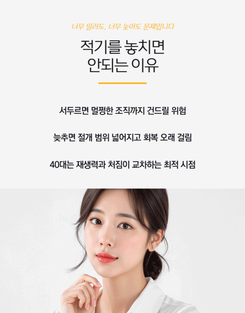 너무 늦으면 늘어진 피부가 많아져 절개 범위가 넓어지고 회복도 길어집니다.