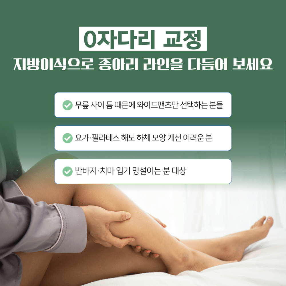 O자 다리 교정 지방이식은 골격을 바꾸지 않고도 시각적으로 다리를 곧게 보이게 하는 방법입니다.