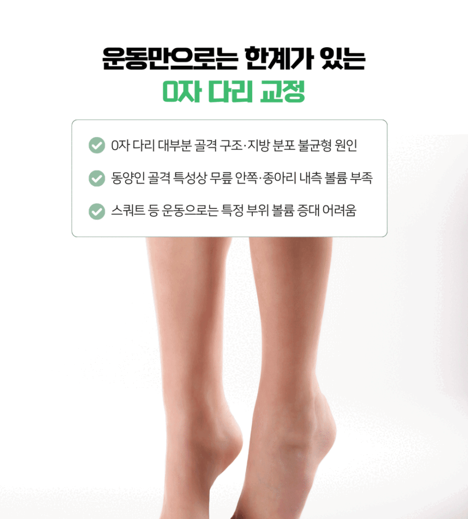 뼈 정렬 문제는 운동으로 바뀌지 않고, 특히 동양인의 경우 유전적으로 무릎 안쪽이나 종아리 안쪽에 볼륨이 부족한 경우가 많습니다.