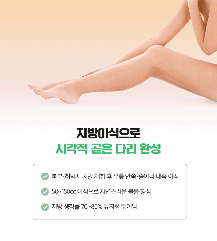 복부나 허벅지에서 본인 지방을 채취해 정제한 뒤, 무릎 안쪽과 종아리 내측에 볼륨을 보완하는 방식으로 진행됩니다.