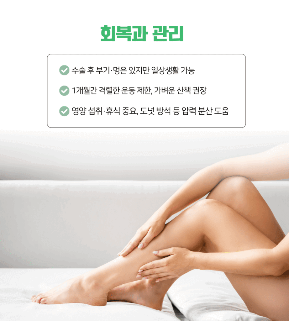 한 달 정도 지나면 붓기가 많이 빠지고, 3개월 정도면 자연스러운 다리 라인이 완성됩니다.