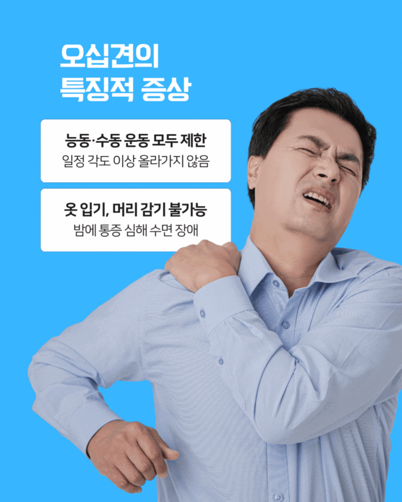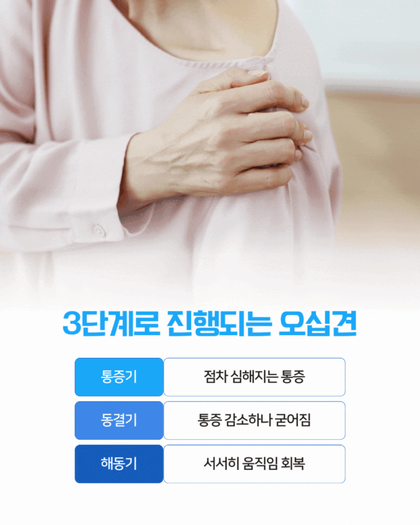 특히 옷을 입거나 머리를 감는 동작에서 통증이 심해지고, 움직임이 뻣뻣해지는 걸 느끼실 거예요.