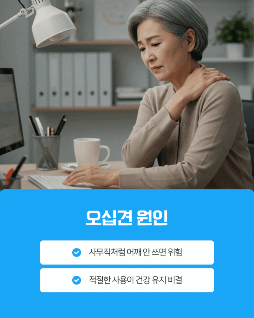 마지막으로, 오십견을 예방하려면 평소 어깨를 적당히 움직여주는 게 중요합니다. 사무직이시라면 틈틈이 스트레칭을 하고, 집안일을 하시더라도 어깨를 부드럽게 돌리는 동작을 습관화해보세요. 당