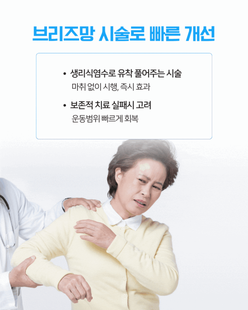 그래도 호전이 없으면 ‘브리즈망’이라는 시술을 고려합니다. 이건 관절낭에 생리식염수를 주입해서 유착된 부분을 풀어주는 방법인데, 마취 없이도 할 수 있고 움직임 범위를 빠르게 개선할 수 있죠.