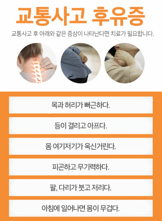 사고 후에는 외상이 없어 보여도 며칠 뒤 통증이 생기는 경우가 많아요.