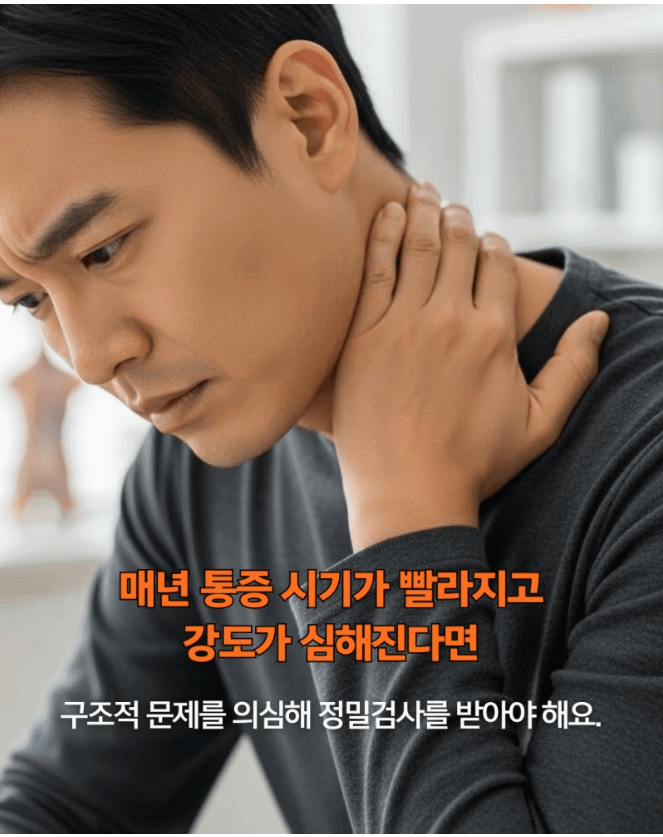 아침마다 목이 굳어 한참을 풀어야 움직일 수 있고, 작년과 똑같은 불편함이 올해도 찾아왔다면, 그냥 날씨 탓으로 넘기기엔 조금 걱정이 될 수 있어요.