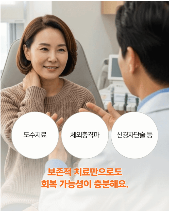 정밀 진단 장비를 갖추고 도수치료·체외충격파·신경차단술 등 다양한 보존적 방법들을 제공할 수 있는 곳이라면, 안심하고 회복 과정을 밟아갈 수 있을 거예요.