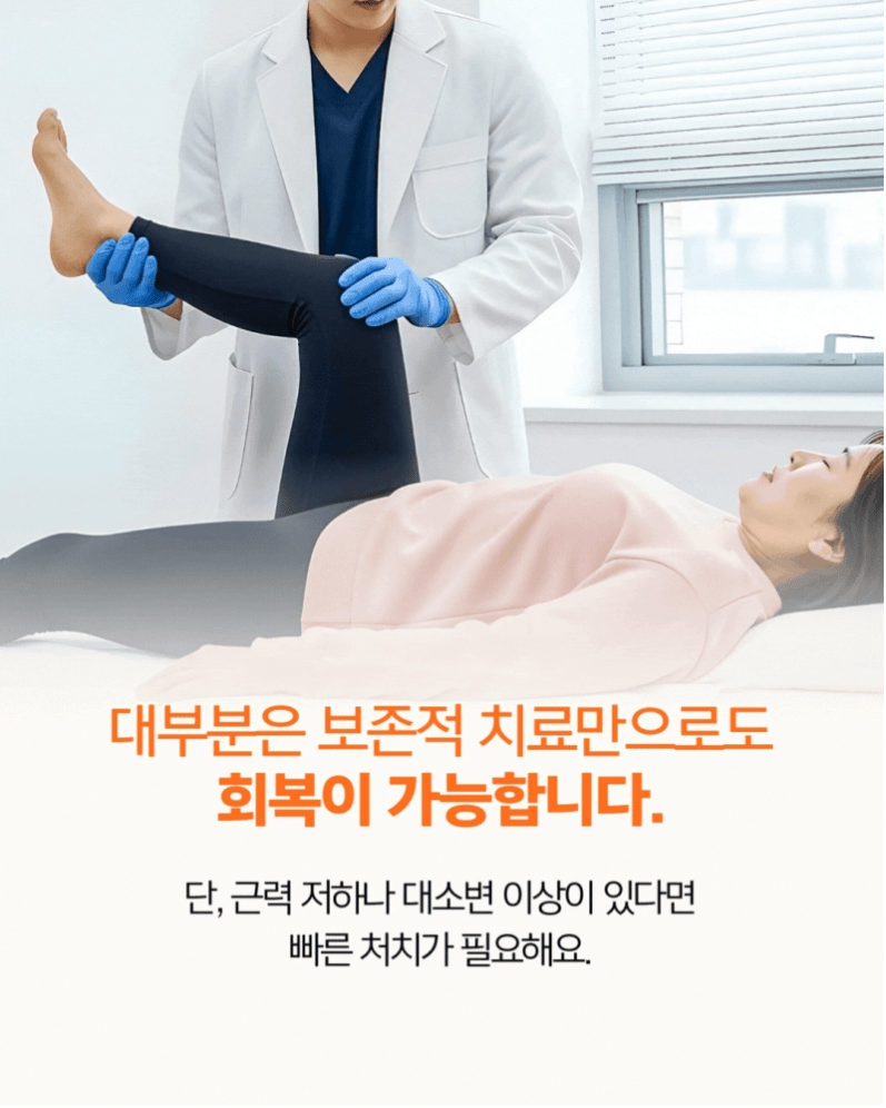 신경 압박으로 인해 근력 저하가 진행되거나, 대소변 장애와 같은 응급 증상이 동반된다면 이야기가 달라져요.