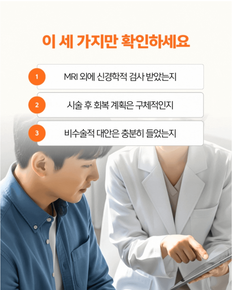 신경 압박의 정도가 어느 수준인지, 근력 저하가 나타나고 있는지, 보존적 관리로 회복될 가능성은 어느 정도인지.