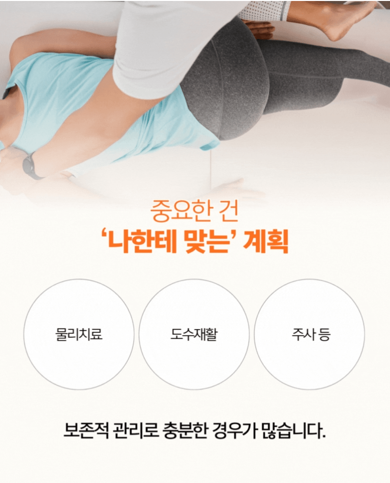 보존적 관리, 주사 요법 병행, 그리고 꼭 필요한 경우의 수술적 개입까지요.