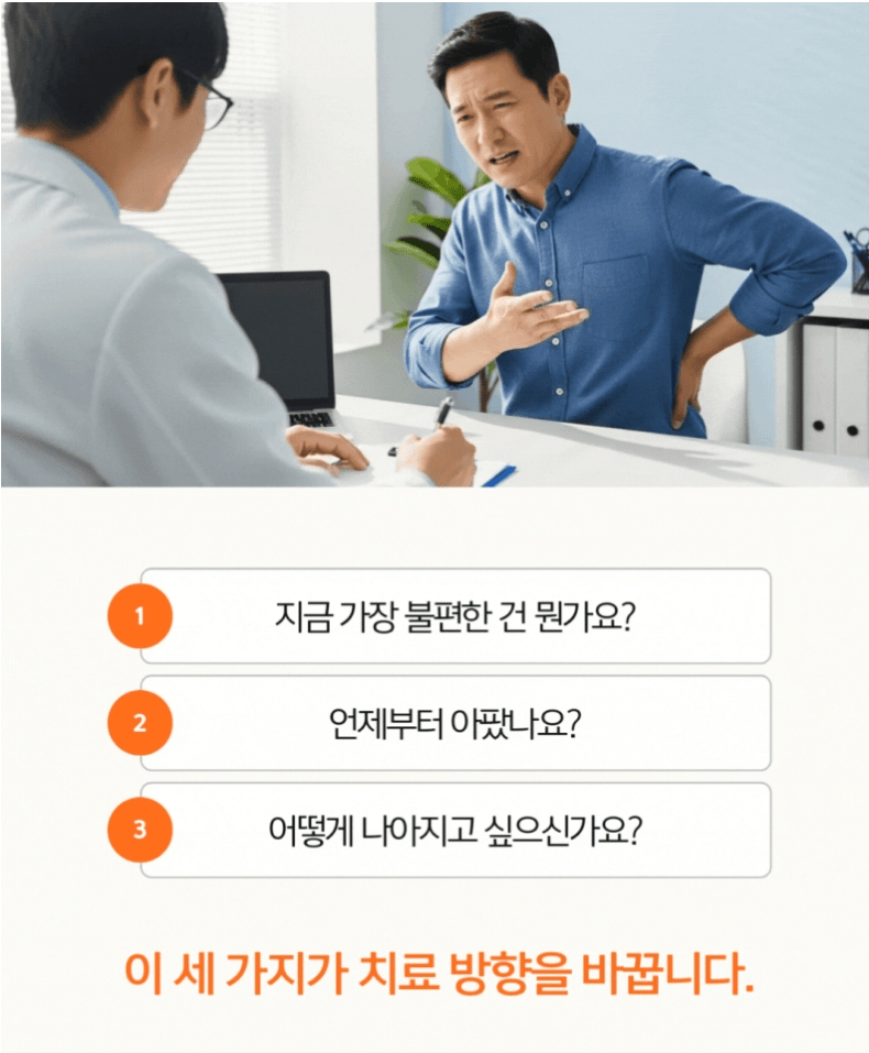 둘째, 언제부터 불편하셨나요? 갑작스럽게 다치신 건지, 서서히 나빠진 건지에 따라 접근 방식이 달라집니다.