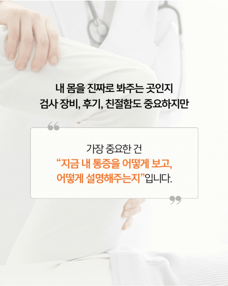그런데 진짜 중요한 건 따로 있어요. 내 몸 상태를 정확히 파악하고, 지금 나에게 필요한 게 무엇인지 솔직하게 이야기해 주는 곳을 만나는 것입니다.