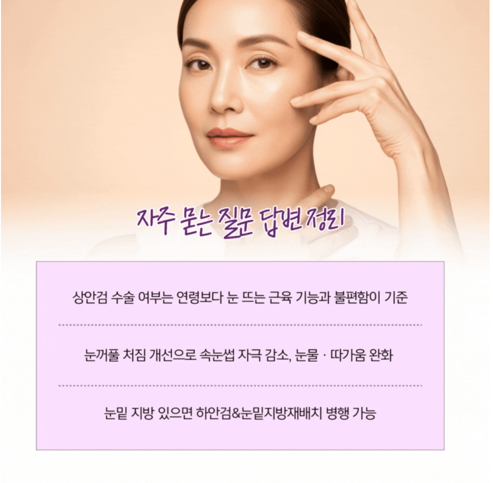 Q. 나이가 많아야만 상안검을 받을 수 있나요? 꼭 그렇지는 않아요. 연령보다는 처짐의 정도, 눈을 뜨는 근육의 상태, 그리고 실제로 불편함이 있는지 여부가 더 중요한 판단 기준이 됩니다.