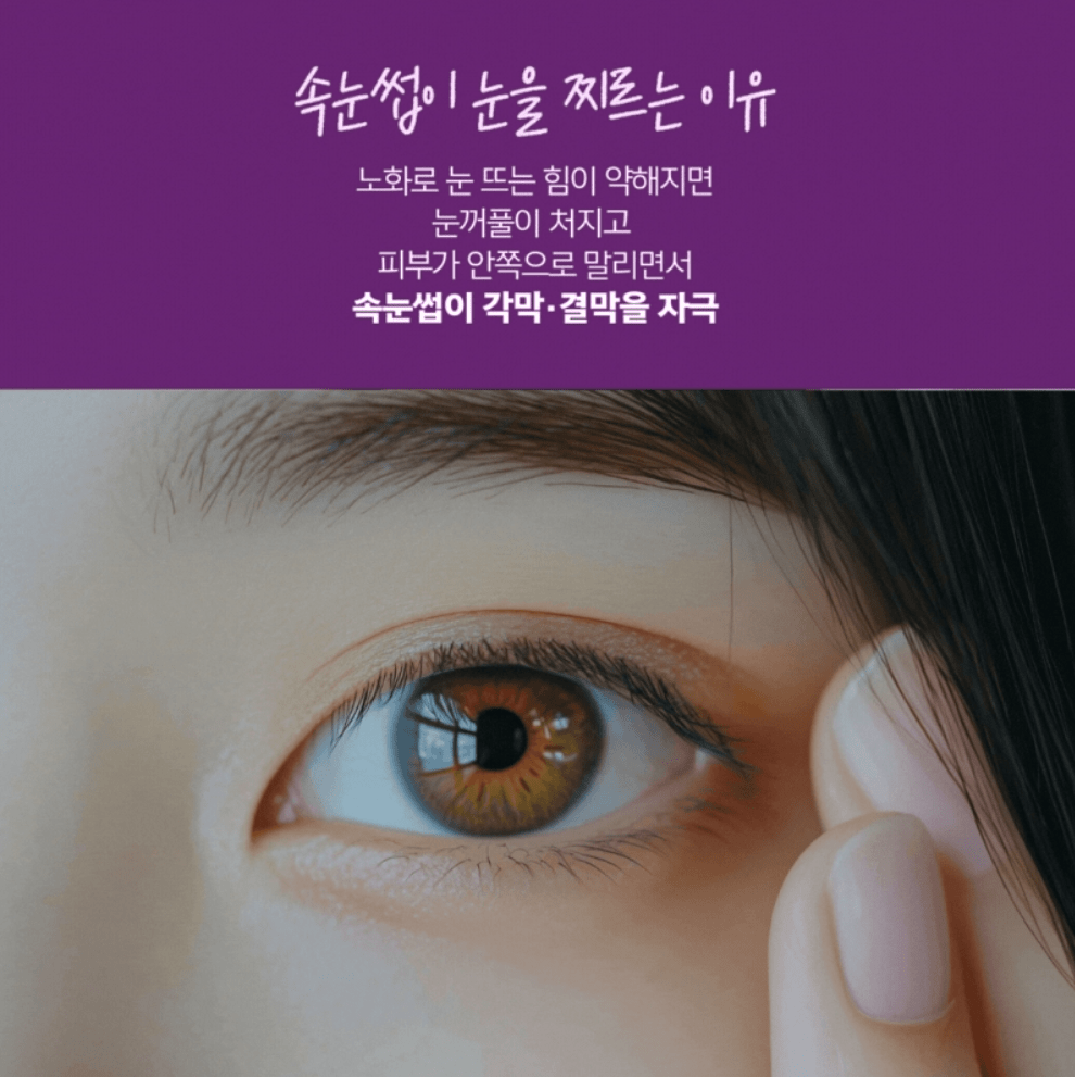 이렇게 방향이 바뀐 속눈썹은 각막과 결막을 반복적으로 건드리게 되고, 그 결과 충혈·이물감·과도한 눈물 분비로 이어질 수 있습니다. 방치하면 각막에 손상이 생기는 경우도 있어요. 겉으로는 ‘속눈썹 문제’처럼 보이지만, 실은 눈꺼풀 처짐이 원인인 경우가 적지 않습니다.