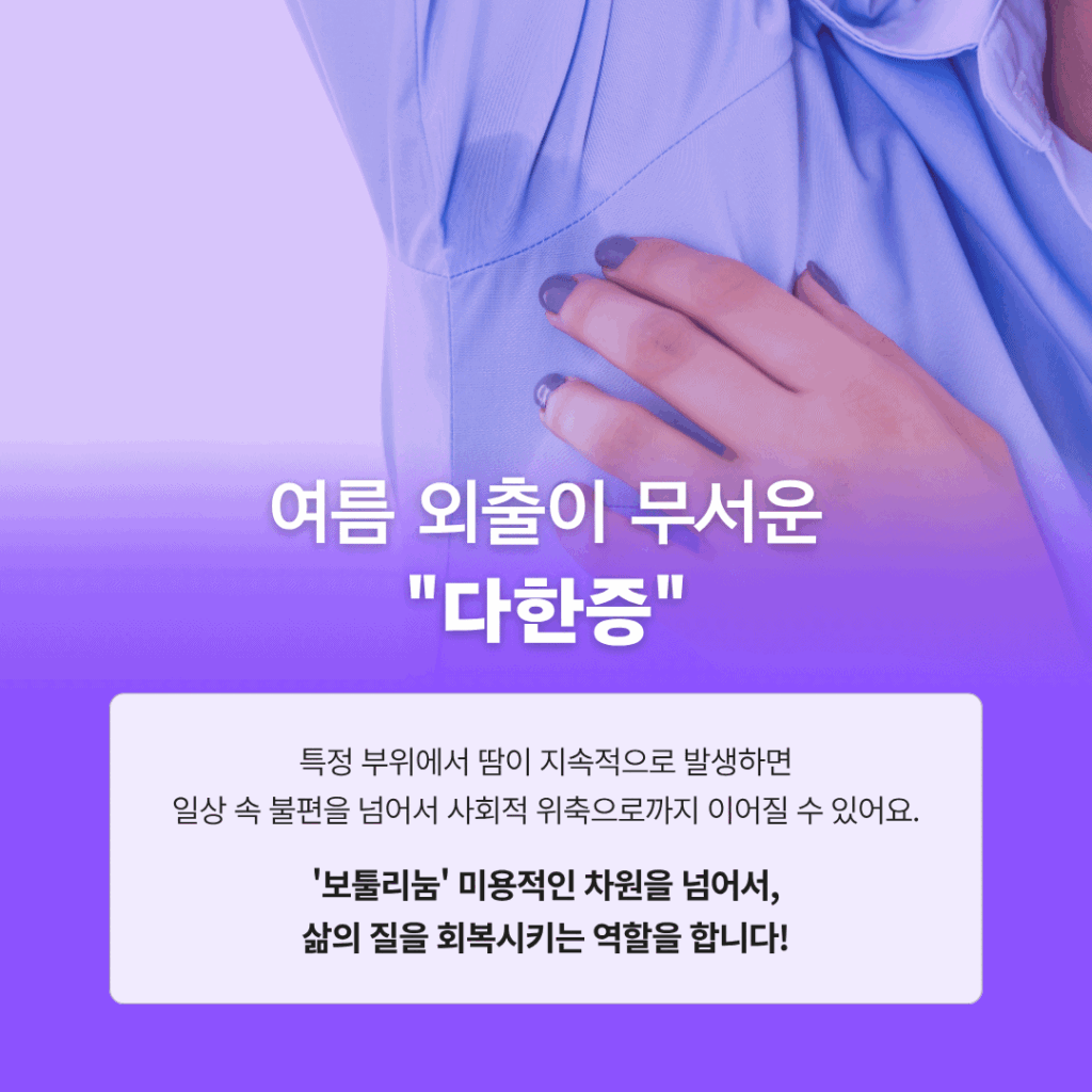 이 시술은 단순히 땀을 줄이는 데 그치지 않고, 옷을 고를 자유, 자신 있게 손을 드는 순간, 편안한 대인관계를 되찾아줍니다.