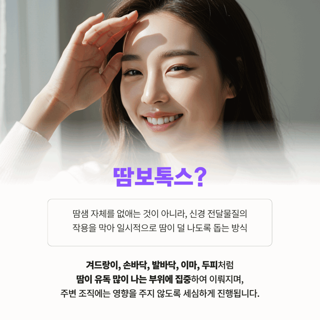 주변 조직에는 영향을 주지 않도록 세심하게 관리하죠. 이 점이 땀보톡스가 안전하고 효과적인 이유 중 하나입니다.