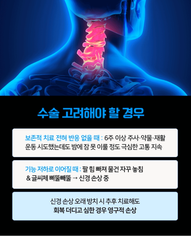 많은 분이 “혹시 목을 제대로 돌리지 못하게 되면 어쩌지..”, “수술해도 다시 아프면 어떡하지?” 하는 두려움 때문에 결정을 미루곤 합니다.