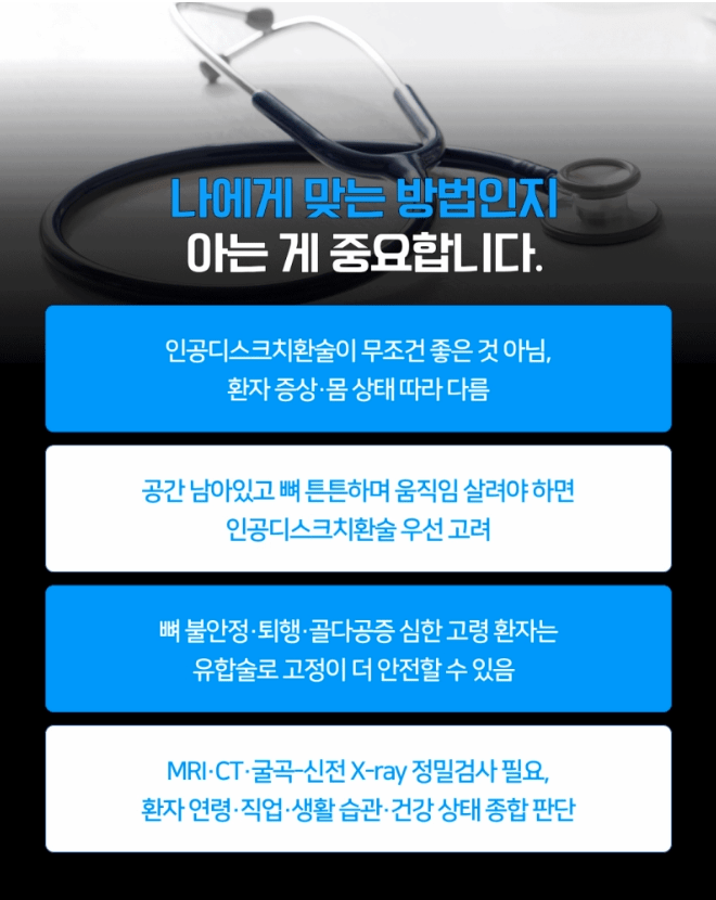 반대로 뼈가 이미 불안정하거나 퇴행과 골다공증이 심한 고령 환자분이라면 무리하게 움직임을 만들기보다 단단하게 ‘유합술’로 고정하는 것이 더 안전한 선택일 수도 있어요.
