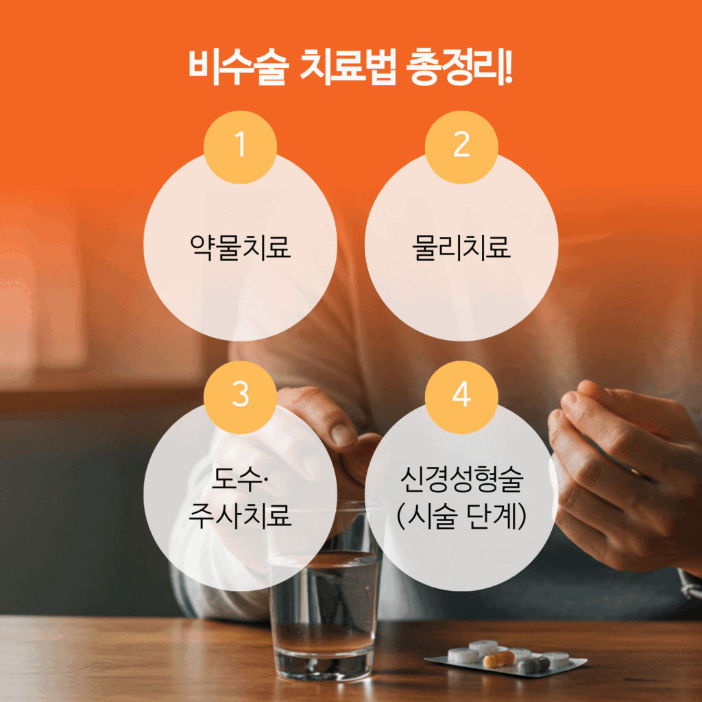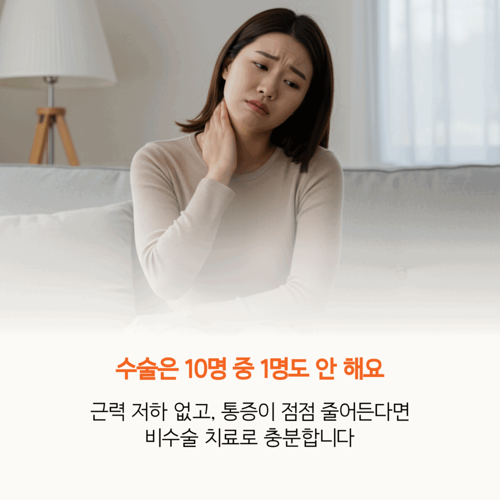 실제로 수술이 필요한 경우는 10명 중 1명도 채 되지 않습니다. 아래 4가지에 해당한다면, 비수술로도 충분히 좋아질 가능성이 높아요.