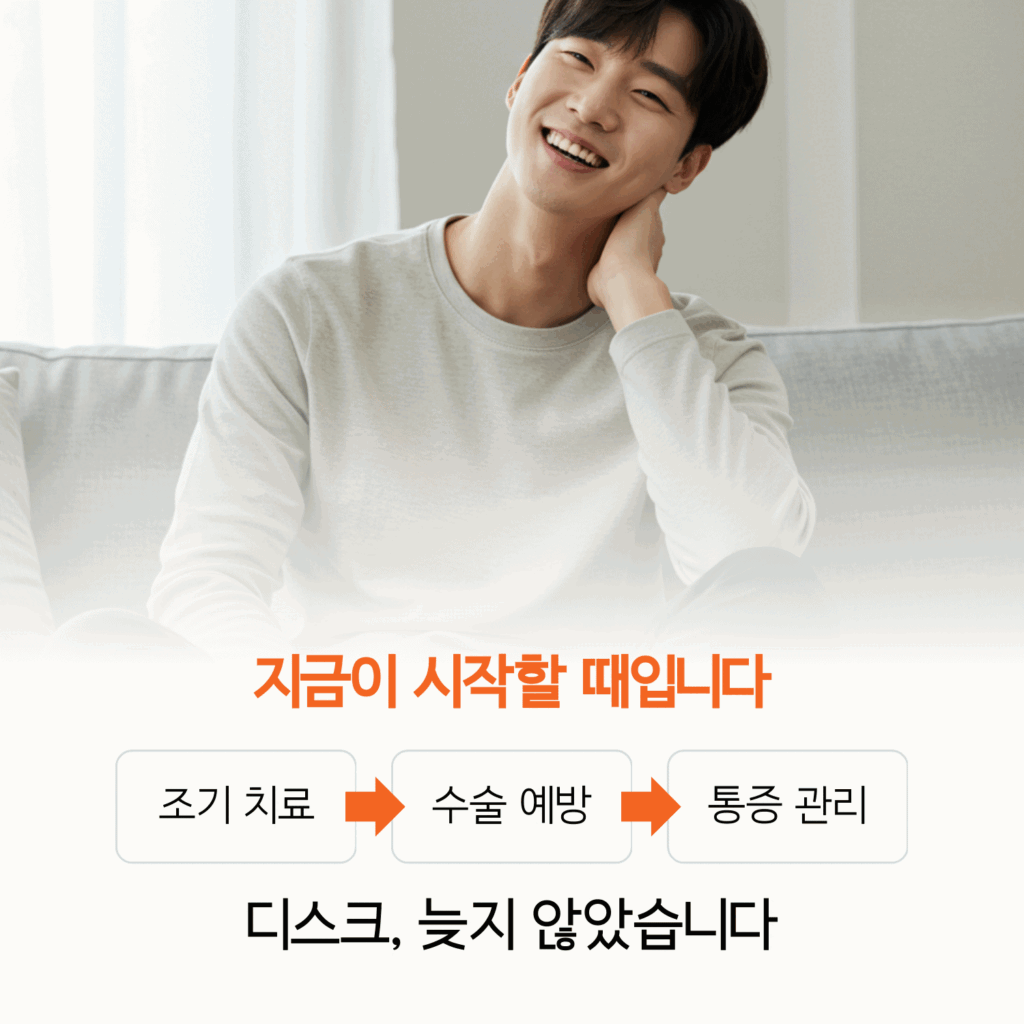 늦지 않게 시작하는 게 가장 중요해요. 조기에 적절한 치료를 시작한다면, 수술 없이도 통증을 멈추고 예전의 일상으로 돌아갈 수 있습니다. 궁금한 점이 있다면 언제든지 저희 병원으로 문의 주세요.