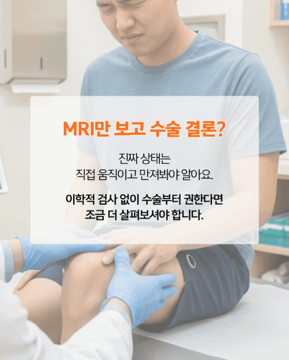 그래서 정밀한 진단을 위해서는 최신 영상 자료와 함께, 직접 관절을 움직여보고 통증 부위를 확인하는 이학적 검사가 병행되어야 합니다.