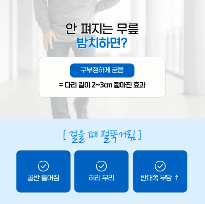 안 펴지는 무릎을 방치하면 일상생활이 무너질 수 있어요.