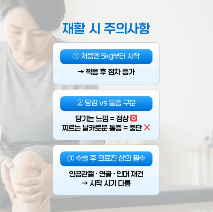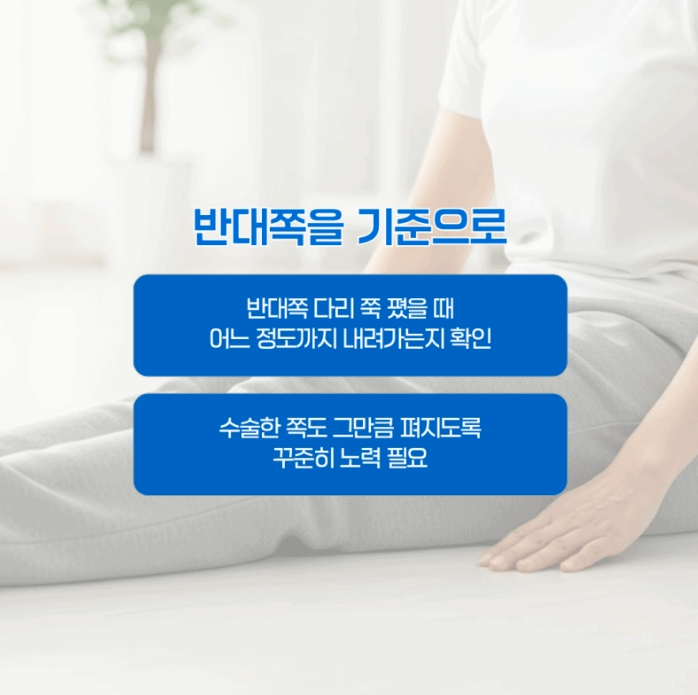 인공관절 수술 후인지, 연골 수술 후인지, 인대 재건 후인지에 따라 접근 방법이 달라져요.