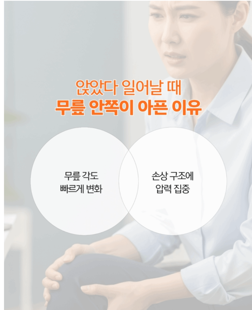 앉았다가 일어날 때 유독 심하게 느껴지는 건, 관절 각도가 급격히 변하면서 손상 부위에 압박이 가해지기 때문이에요.