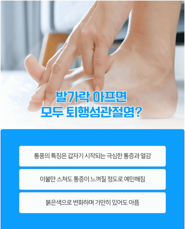 통풍성관절염 때문에 발가락이 부어오르고 빨갛게 변하면서 참기 힘든 통증을 겪는 분들이 생각보다 많아요.