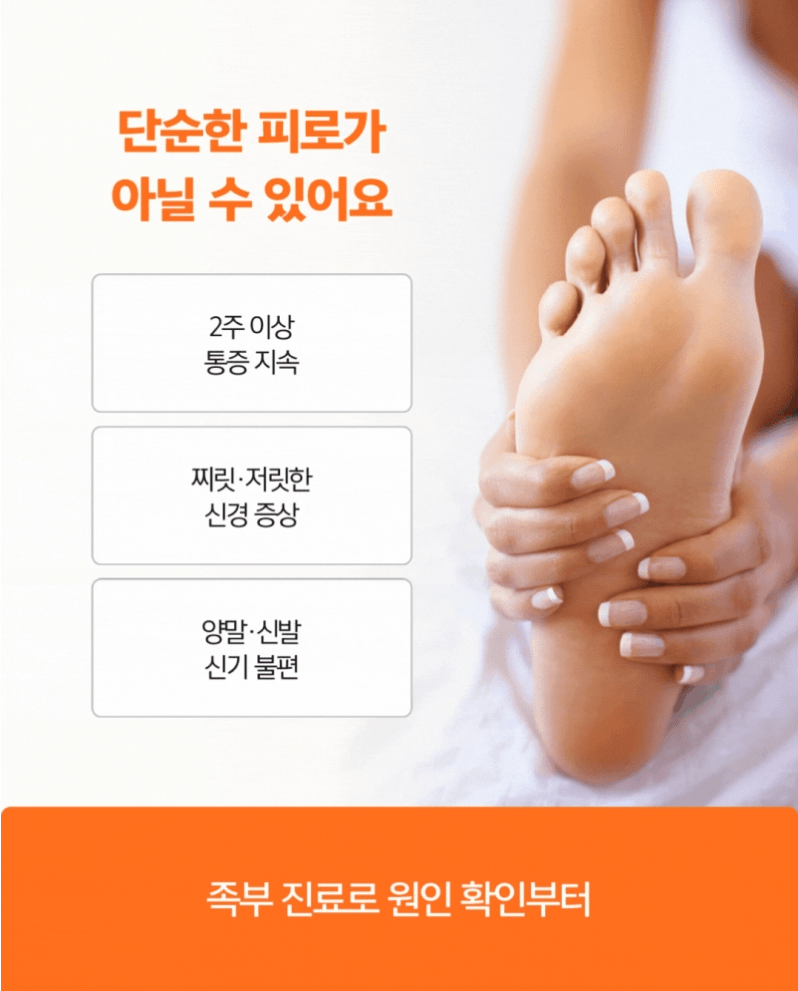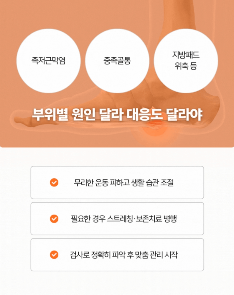 같은 발 안에서도 원인과 접근 방법이 다른 만큼, 내 증상이 어디에 해당하는지 먼저 파악하는 것이 중요합니다.