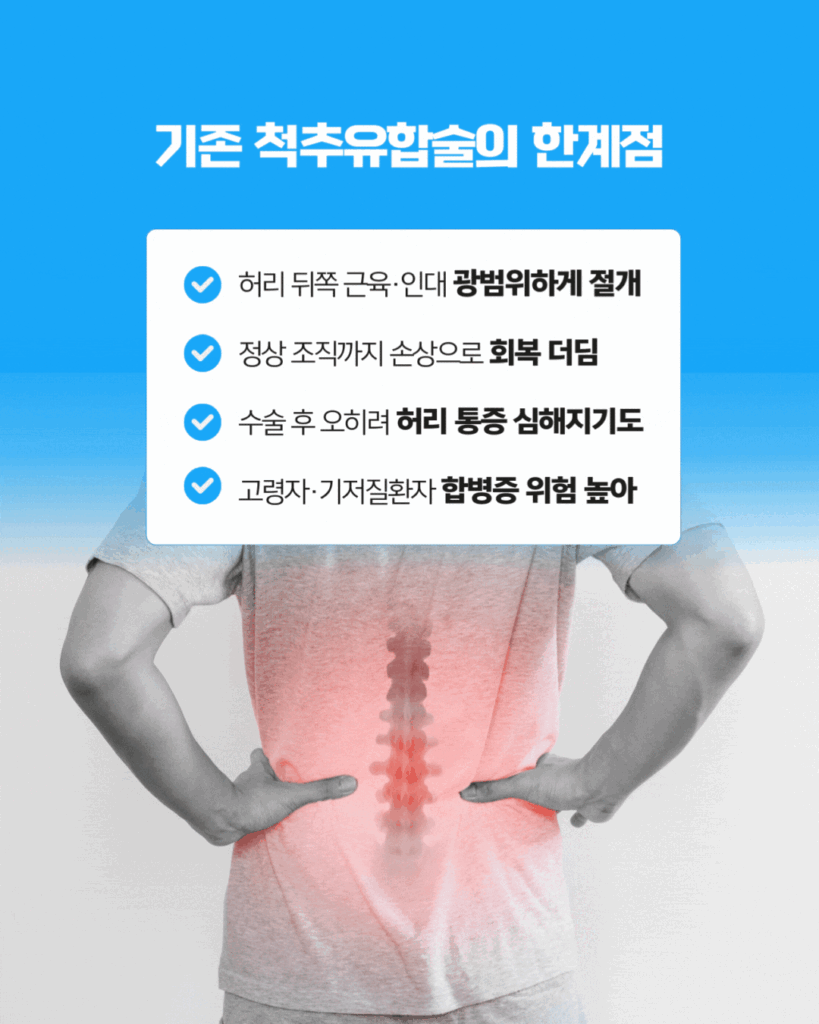 기존의 척추 유합술은 허리 뒤쪽 근육과 인대를 광범위하게 절개해 척추에 접근하는 방식이었습니다. 하지만 이 방식은 상당한 조직 손상을 동반했기 때문에, 수술 후 오히려 허리 통증이 더 심해지는 경우가 종종 있었습니다.