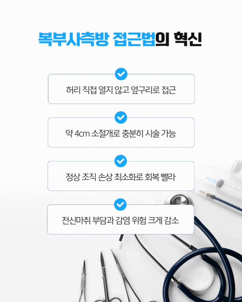 반면, 제가 소개드리고 싶은 복부 사측방 접근법은 허리를 직접 열지 않고 옆구리 부분을 통해 접근하는 방식입니다. 약 4cm 정도의 작은 절개로도 시술이 가능해 회복이 훨씬 빠릅니다.
