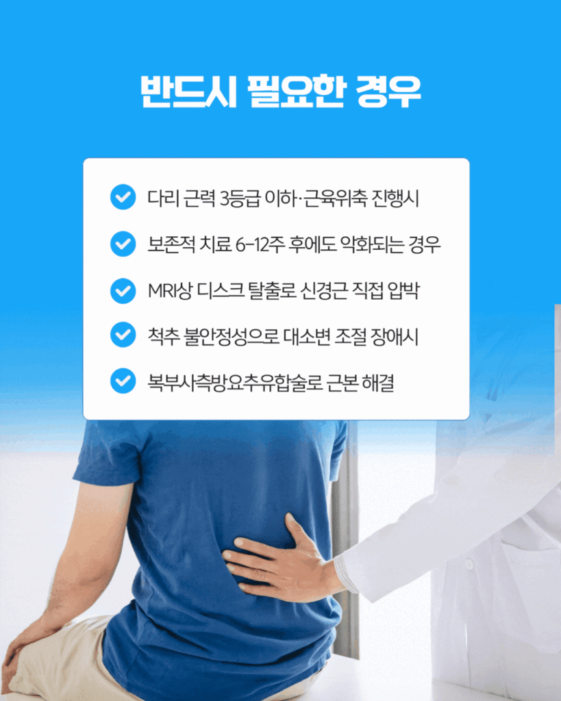 예를 들어, 다리의 근력이 현저히 약해지거나 근력 3등급 이하로 떨어지며 근육 위축이 진행되는 경우가 이에 해당합니다. 이런 증상이 급격히 진행된다면 빠르게 수술을 결정해야 합니다.