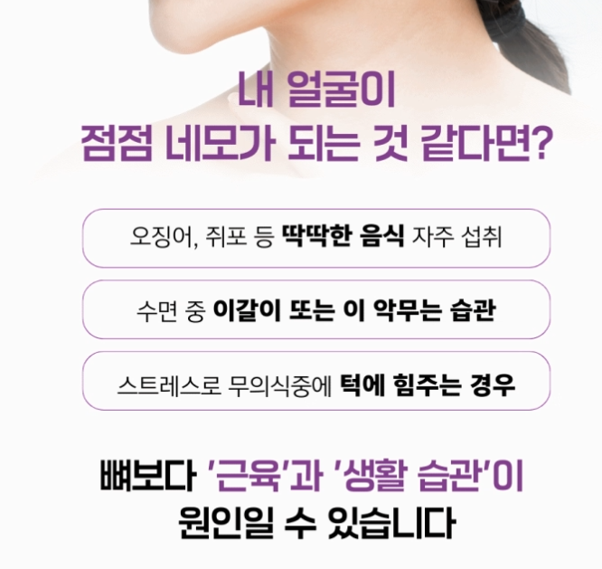 얼굴형이 점점 각져 보이고 사진만 찍으면 턱이 네모처럼 보여 고민이신 분들이 많은 요즘, 많은 분들이 뼈 구조 때문이라고 단정 짓지만 실제로는 의외의 원인이 숨어 있는데요.