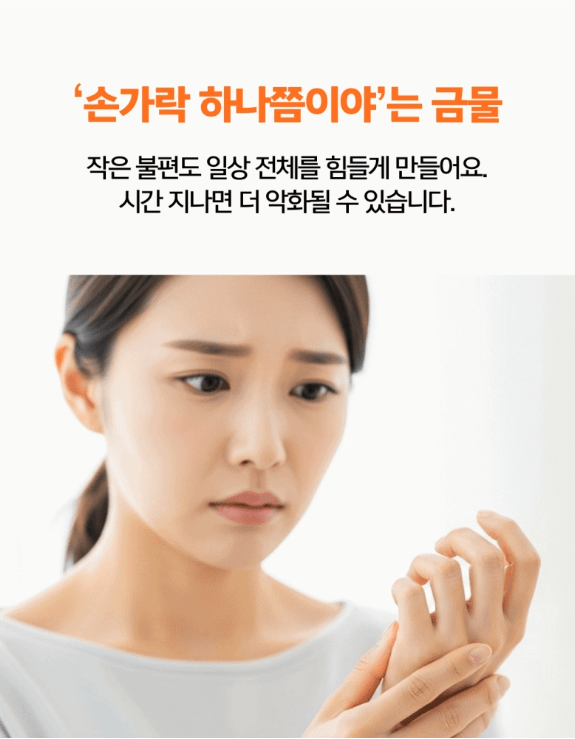 병원 방문을 고려하면서도, 단지 손가락 하나 때문에 진료를 받는 것이 과한 게 아닐까 싶어 미루게 되는 경우가 대부분입니다.