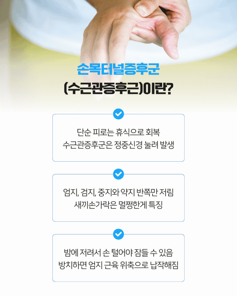 피로는 휴식을 취하면 금세 회복되지만, 수근관증후군은 손목 안의 정중신경이 눌리면서 생기는 질환이라 휴식만으론 해결되지 않거든요.