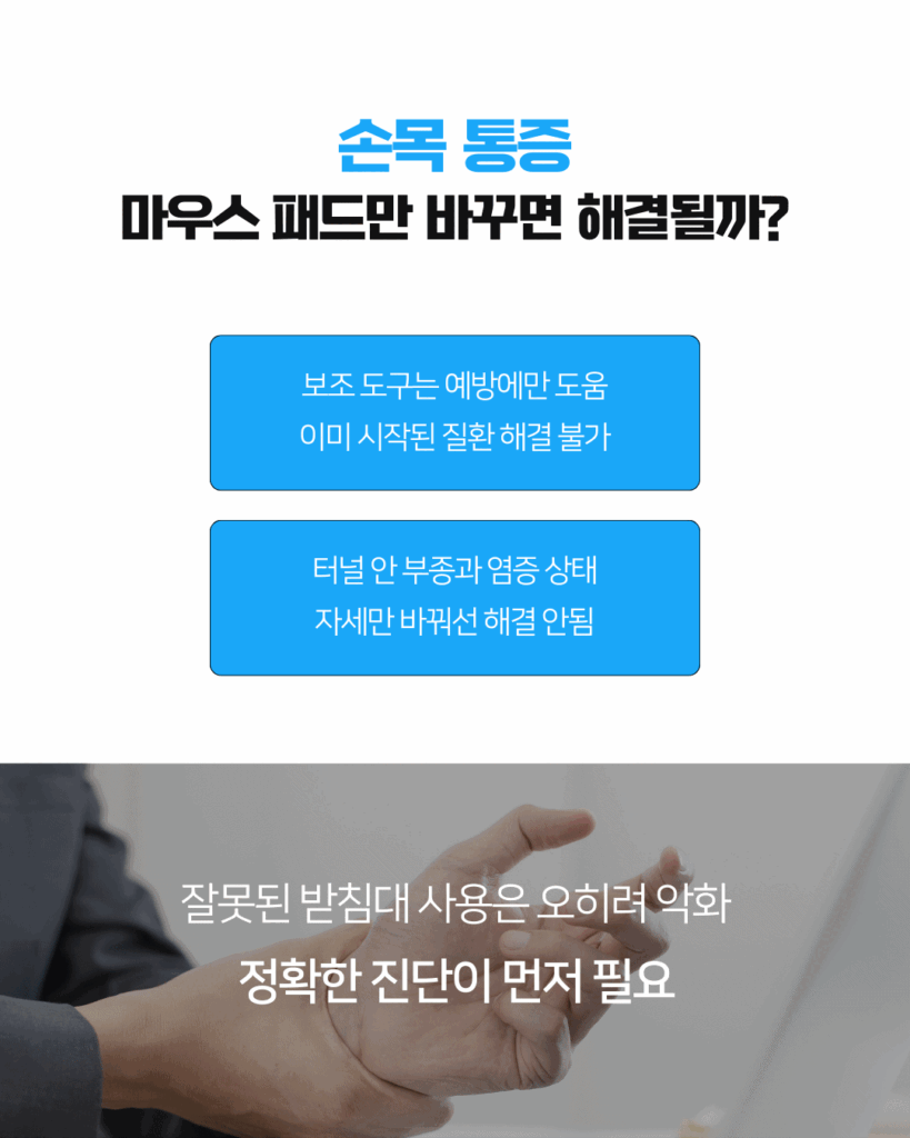 이런 보조 도구들은 예방에는 도움이 될 수 있지만, 이미 시작된 수근관증후군을 치료하지는 못합니다. 손목 안의 터널이 붓고 염증이 생긴 상태에선 자세를 바꾼다고 근본적인 문제가 해결되지 않거든요.