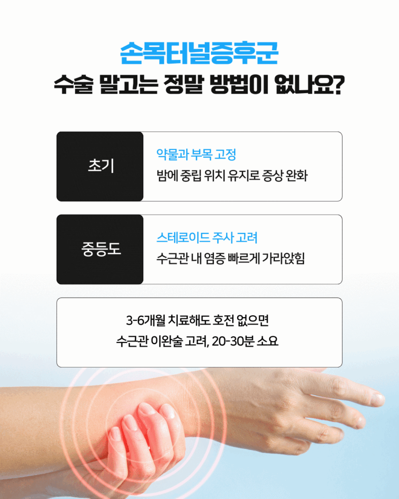 수근관증후군이 초기라면 수술 없이도 충분히 호전될 수 있습니다.