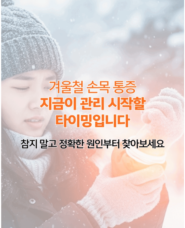 겨울에는 차가운 공기 탓에 손 부위가 굳어지고 부종이 생기면서 통로가 더 좁아져 손목통증이 심화되는 경우가 빈번합니다.