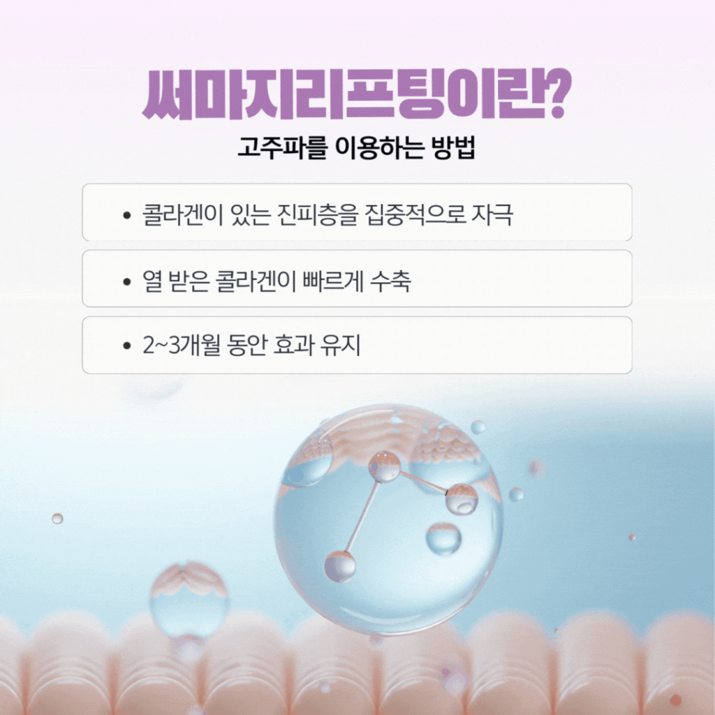 이 열이 늘어진 근막을 순간적으로 수축시켜 마치 비닐이 열에 오그라들듯 얼굴의 기본 틀을 단단히 잡아줍니다. 시술 직후에도 당김 효과를 느낄 수 있고, 시간이 지나면서 콜라겐이 새로 생성되며 효과가 점점 더 좋아져요.