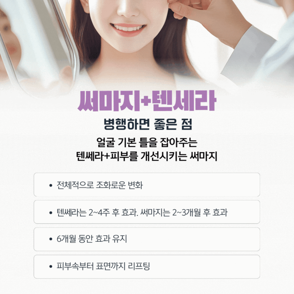 텐쎄라와 써마지를 함께하면 정말 놀라운 시너지가 생겨요. 텐쎄라는 얼굴의 기본 구조를 단단히 잡아주고, 써마지는 피부 자체의 탄력과 질감을 개선시키니까 전체적으로 조화로운 변화가 일어나죠.