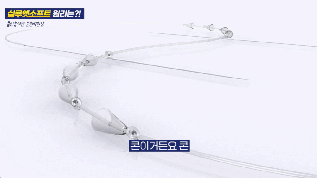 실루엣소프트의 가장 큰 차별점은 바로 이 콘 구조예요. 일반 실에 있는 가시와 달리, 여러 개의 매듭 사이에서 미세하게 움직이며 자리를 잡도록 설계되어 있어요.