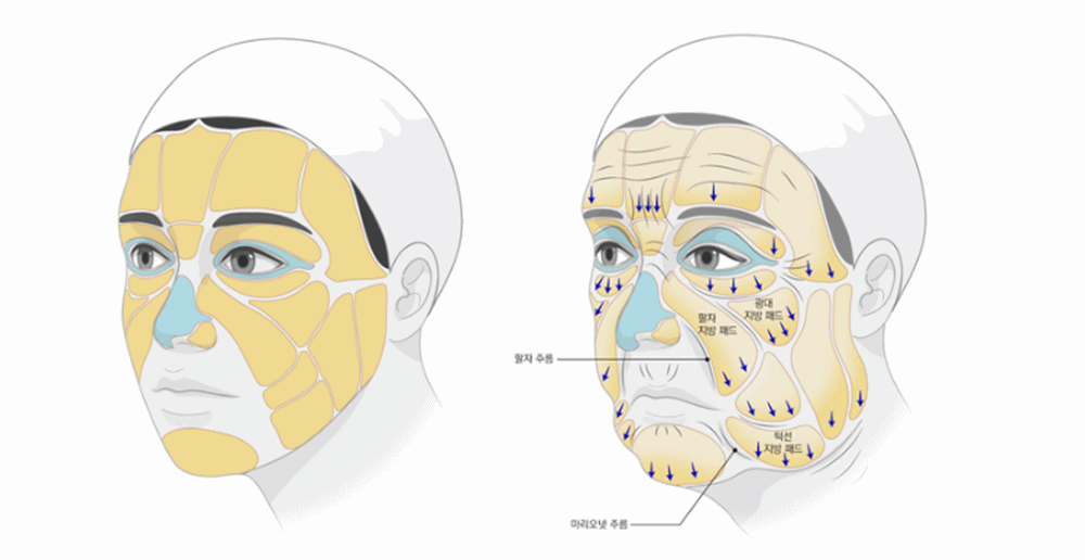 뼈의 형태 변화, 지방의 이동, 근육과 인대의 약화,그리고 진피층의 콜라겐 감소가 동시에 일어나죠.