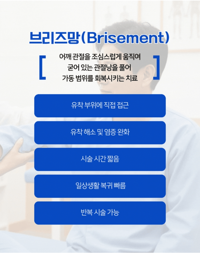 브리즈망 시술은 절개 없이 굳어 있는 관절낭을 풀어 움직임을 되찾는 방법으로, 비교적 짧은 시간 안에 마칠 수 있고 대부분 입원 없이 진행됩니다. 시술 후에는 가동 범위를 유지하기 위한 재활이 병행됩니다.