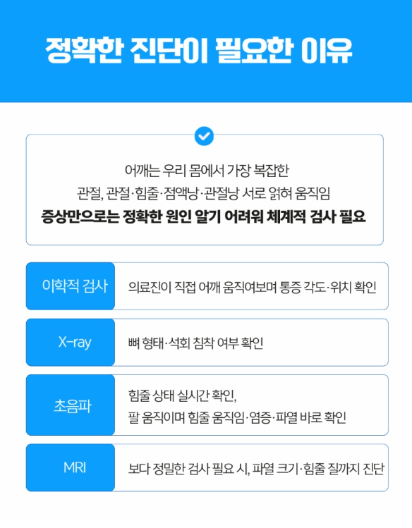 관절, 힘줄, 점액낭, 관절낭이 서로 연결되어 움직이기 때문에, 증상만으로는 명확한 원인을 파악하기 어려워 체계적인 검사가 필수입니다.