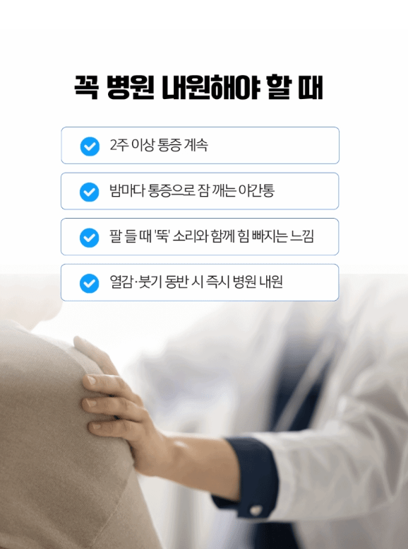 하지만 팔을 들 때 ‘뚝’ 소리와 함께 힘이 빠지는 느낌이 들거나, 열감과 붓기가 동반된다면 빠르게 병원을 내원해야 하죠.