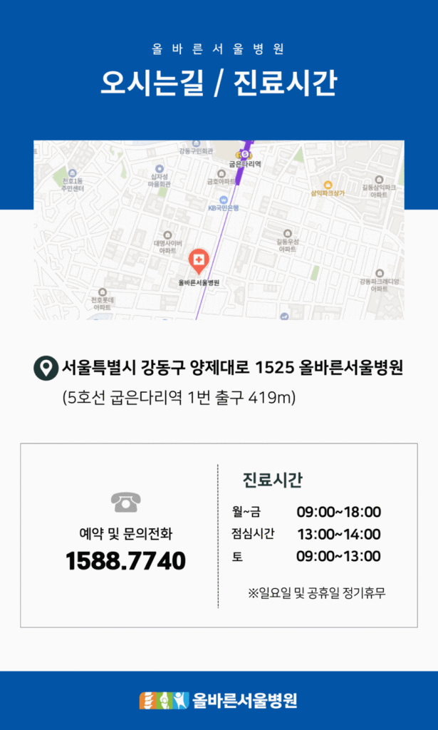 물론 명확한 진단은 영상 검사가 필요하지만, 이렇게 미리 알아두시면 내원 전 조금은 염려를 덜 수 있으실 거예요.
