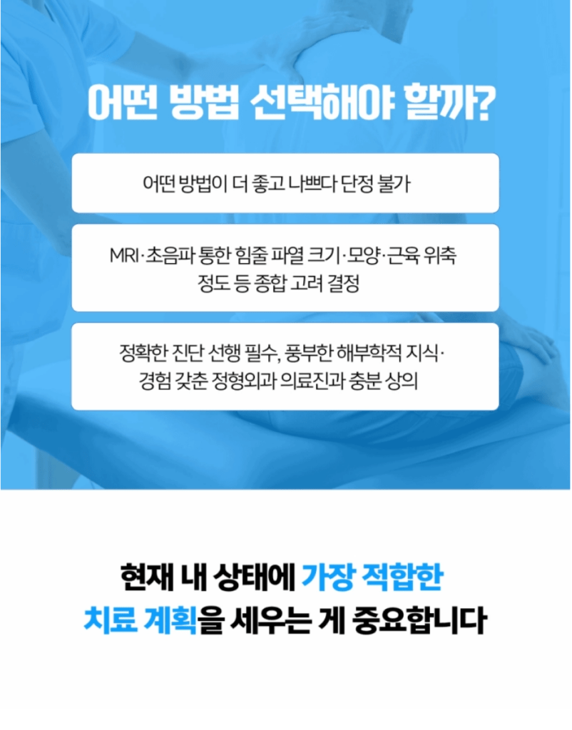 MRI나 초음파 같은 정밀 검사를 통해 확인된 힘줄의 파열 크기와 모양, 그리고 근육의 위축 정도 등을 종합적으로 고려해서 결정해야 할 문제예요.