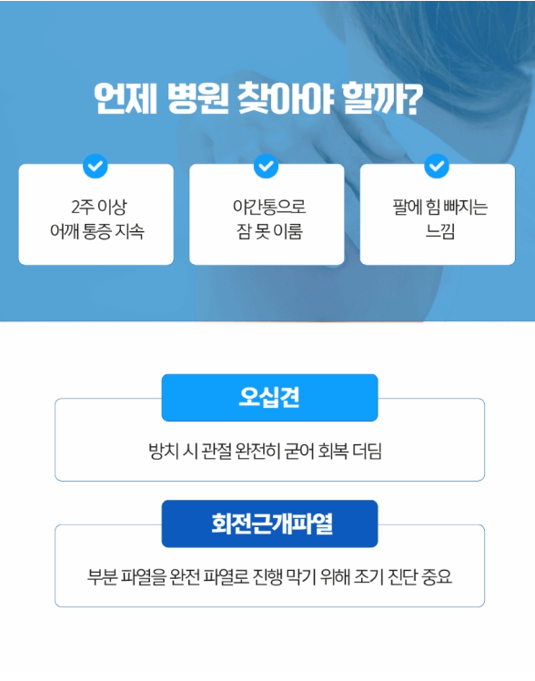 2주 넘게 어깨 통증이 지속되거나, 야간통으로 잠을 못 이루거나, 팔에 힘이 빠지는 증상이 있다면 진료를 받으시는 게 좋습니다.