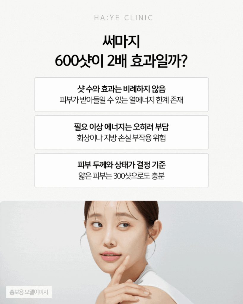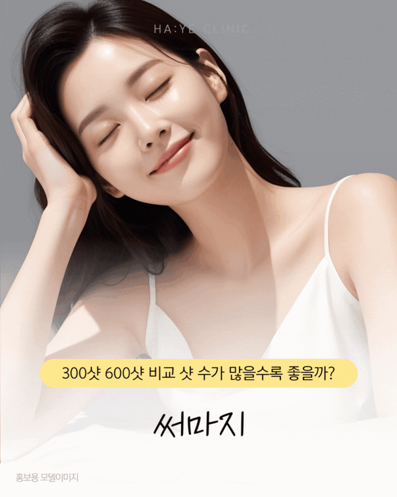 요즘 환자분들을 뵙다 보면 “써마지 300샷이면 충분하다던데, 600샷 받으면 효과가 두 배인가요? 비용 차이가 크던데 정말 그만큼 차이가 날까요?”라는 질문을 정말 많이 받습니다.